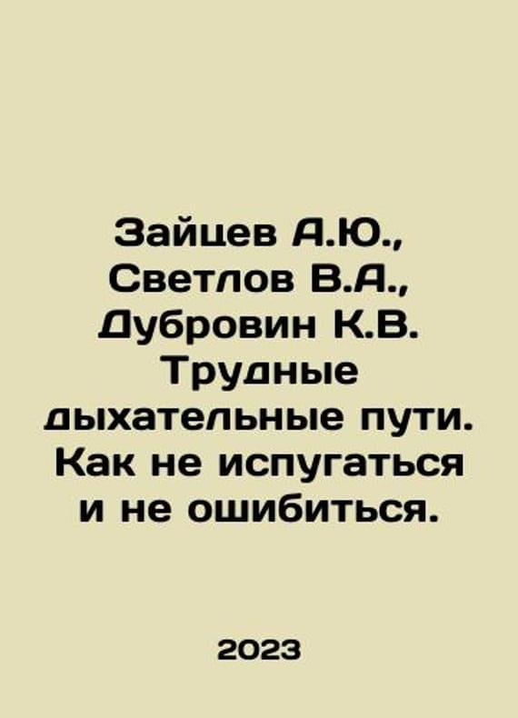 Zaitsev A.Yu, Svetlov V.A., Dubrovin K.V. Difficult airways. How not to be afraid and not to be mistaken. In Russian /Zaytsev A.Yu., Svetlov V.A., Dubrovin K.V. Trudnye dykhatelnye puti. Kak ne ispugatsya i ne oshibitsya. M Gaotar Media 2023 128 pp. We have thousands of titles and often several copies of each title may be available. Please feel free to contact us for a detailed description of the copies available. SKUalbb031ae6d24fdf9df.