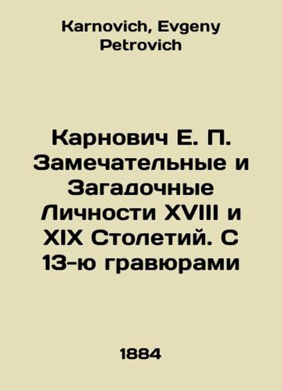 Karnovych E. P. Remarkable and Mysterious Personalities of the 18th and 19th Centuries. With 13 Engravings In Russian /Karnovich E. P. Zamechatelnye i Zagadochnye Lichnosti XVIII i XIX Stoletiy. S 13-yu gravyurami 1884. 520p.. We have thousands of titles and often several copies of each title may be available. Please feel free to contact us for a detailed description of the copies available. SKUalbb0779fe264c07399.