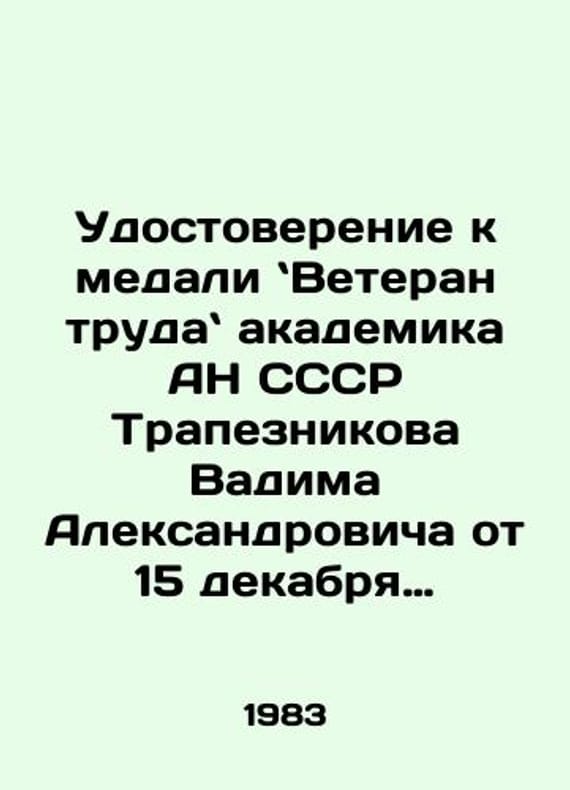 Certificate of Medal: Veteran of Labor of Academician of the Academy of Sciences of the USSR Vadim Trapeznikov dated December 15, 1983 In Russian /Udostoverenie k medali Veteran truda akademika AN SSSR Trapeznikova Vadima Aleksandrovicha ot 15 dekabrya 1983 g. By the decision of the Executive Committee of the Moscow City Council of Peoples Deputies of November 28, 1983, M. MIPF Goznak of 1978, 4 p. Certificate: Vadim Trapeznikov for long-term conscientious work on behalf of the Presidium of the Supreme Soviet of the USSR, by the decision of the Executive Committee of the Moscow City Council of Peoples Deputies of November 28, 1983, was awarded the medal Labor veteran. Secretary of the Executive Committee of the Moscow City Council of Peoples Deputies (fax). We have thousands of titles and often several copies of each title may be available. Please feel free to contact us for a detailed description of the copies available. SKUalbb1f756a778fe5b2d.