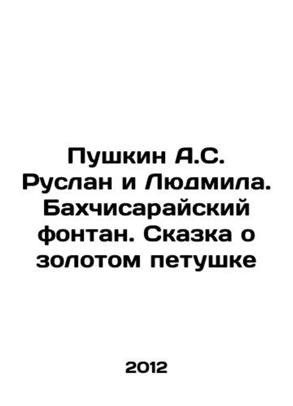 Pushkin A.S. Ruslan and Lyudmila. The Fountain of Bakhchisaray. The Tale of the Golden Cockerel In Russian /Pushkin A.S. Ruslan i Lyudmila. Bakhchisarayskiy fontan. Skazka o zolotom petushke Series: M. Fortune EL 2012 Book Collection. We have thousands of titles and often several copies of each title may be available. Please feel free to contact us for a detailed description of the copies available. SKUalbb2631f7bc8e37984.