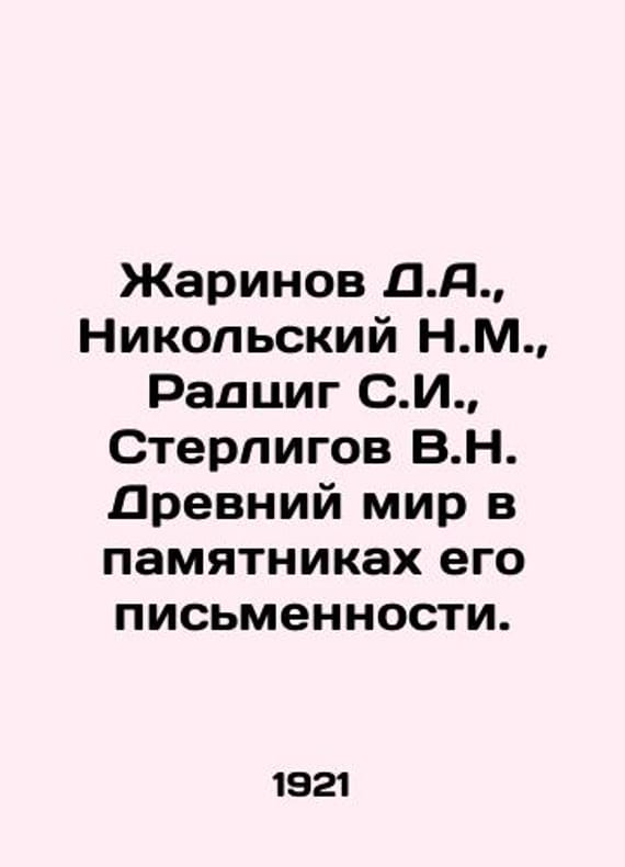 Zharinov D.A., Nikolsky N.M., Radzig S.I., Sterligov V.N. The ancient world in the monuments of its writing. In Russian /Zharinov D.A., Nikolskiy N.M., Radtsig S.I., Sterligov V.N. Drevniy mir v pamyatnikakh ego pismennosti. M. T the World 1915. We have thousands of titles and often several copies of each title may be available. Please feel free to contact us for a detailed description of the copies available. The delivery of this book might be delayed beyond the usual timeframe due to extended processing and preparation before shipment, and faster shipping opSKUalb220e3a146d06dfcd
