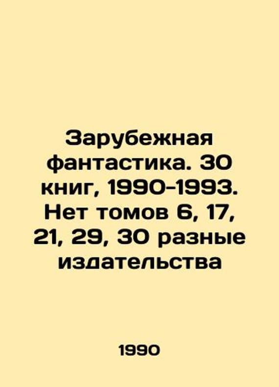 Foreign fiction. 30 books 1990-1993. No volumes 6 17 21 29 30 different publishers /Zarubezhnaya fantastika. 30 knig 1990-1993. Net tomov 6 17 21 29 30 raznye izdatel'stva Series: Foreign Fiction 1990-1992. In addition to 30 books. 1990-1992. 1 Volume Clement H. Fire Cycle. 2 Volume Garrison G. Deadly World. 3 Volume Bester A. The Man Without a Face. 4 Volume The Andromeda Strain. 5 Volume Le Guin. Hein Cycle. 7 Volume Dilani.The Fall of Towers. 8 Volume Karsak F. Lions Eldorado. 9 Volume Anderson P. Operation Chaos. 10 Volume Klein J. Gods of War. 11-1 Volume Norton A. Koldovskaya World. Troy v. Koldovskaya World. 11-2 Volume Norton A. Koldovskaya World. 12 Volume Norton A. Garan everniy. 13-1 Volume Silverberg R. Valentine Pontific. 13-2 Volume Silverberg R. Valentine Pontific. 14- We have thousands of titles and often several copies of each title may be available. Please feel free to contact us for a detailed description of the copies available. SKUalbb2f3b227bc58029f