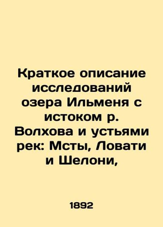 Brief description of the investigations of Lake Ilmena with the source of the Volkhov River and the mouths of the rivers: Msta, Lovati and Sheloni, In Russian /Kratkoe opisanie issledovaniy ozera Ilmenya s istokom r. Volkhova i ustyami rek: Msty, Lovati i Sheloni, Produced by the Ilmenskaya Opium Party in 1885 and 1886 under the leadership of the engineer S. M. Zhvan, St. Petersburg, Moscow, joint venture with the Panteleevs, 1892-26 p. We have thousands of titles and often several copies of each title may be available. Please feel free to contact us for a detailed description of the copies available. SKUalbb45f43d14fcf6d68.
