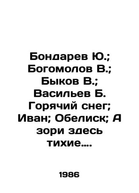 "Yu. Bondaryev; V. Bogomolov; V. Bykov; B. Vasilyev; B. Hot snow; Ivan; Obelisk; A zori here are quiet. In Russian /Bondarev Yu.; Bogomolov V.; Bykov V.; Vasilev B. Goryachiy sneg; Ivan; Obelisk; A zori zdes tikhie. World Library for Children, v.30, n.1 M DL 1986.We have thousands of titles and often several copies of each title may be available. Please feel free to contact us for a detailed description of the copies available. SKUalbb498adad22e4df3c."