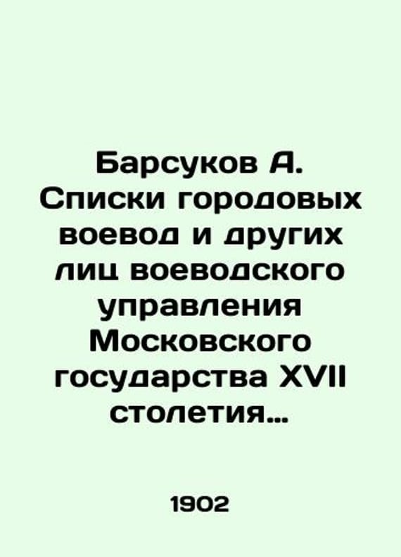 Badsukov A. Lists of city voivodes and other persons of the voivodeship administration of the seventeenth century Moscow State according to printed government acts. In Russian (ask us if in doubt)/Barsukov A. Spiski gorodovykh voevod i drugikh lits voevodskogo upravleniya Moskovskogo gosudarstva XVII stoletiya po napechatannym pravitelstvennym aktam. Short description: In Russian (ask us if in doubt).St. Petersburg: Stasyulevichs Printing House 1902. IX 611 p. We have thousands of titles and often several copies of each title may be available. Please feel free to contact us for a detailed description of the copies available. SKUalbb49d9342b0a2a653