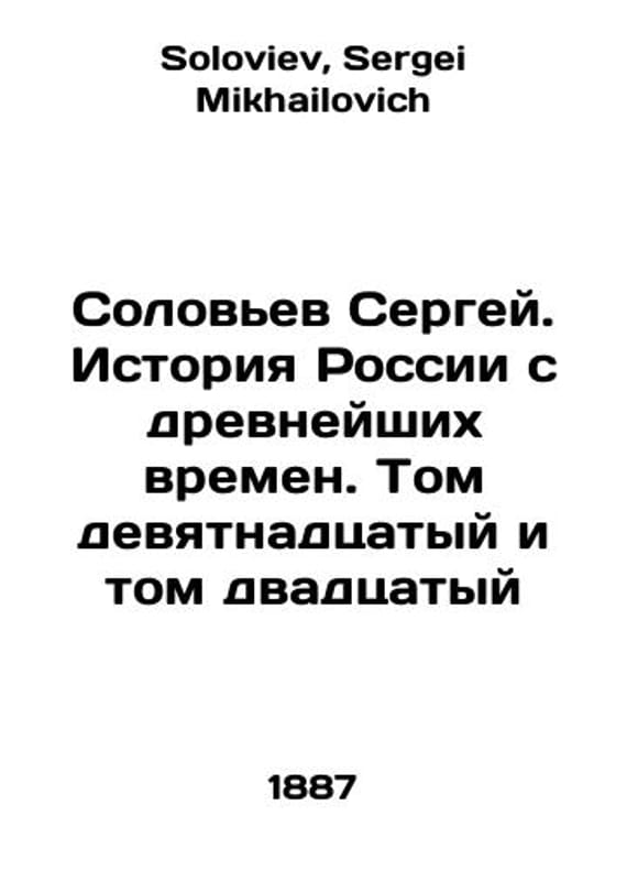 Sergey Solovyov. History of Russia since ancient times. Volume nineteenth and volume twentieth In Russian /Solovev Sergey. Istoriya Rossii s drevneyshikh vremen. Tom devyatnadtsatyy i tom dvadtsatyy Moscow In the University Printing House of 1885, 1887, 384, II, N1, 475, II p. Volume 19. History of Russia during the reign of Emperor Peter II and Empress Anna Ioanov.-Volume 20. History of Russia during the reign of Anna Ioanovna. We have thousands of titles and often several copies of each title may be available. Please feel free to contact us for a detailed description of the copies available. SKUalbb4a6c1a2243f8b43.