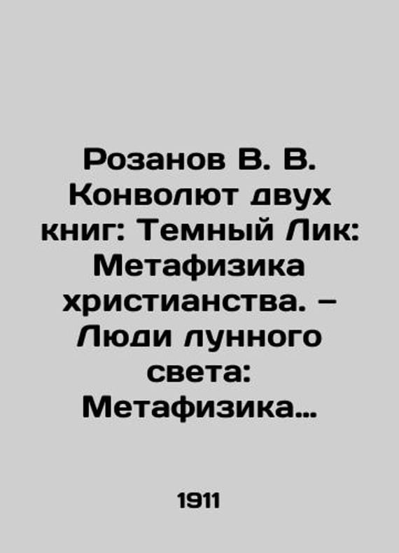 Rozanov V. V. The Convolutee of Two Books: The Dark Face: The Metaphysics of Christianity In Russian (ask us if in doubt)/Rozanov V. V. Konvolyut dvukh knig: Temnyy Lik: Metafizika khristianstva. Lyudi lunnogo sveta: Metafizika khristianstva St. Petersburg: Typography by F. Weisberg and P. Gershunin 1911. XVI 285 and IX 199s. We have thousands of titles and often several copies of each title may be available. Please feel free to contact us for a detailed description of the copies available. SKUalbb4ad391ca2048864