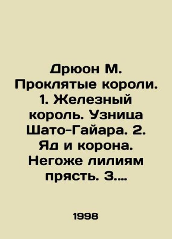 Dryon M. Cursed Kings. 1. Iron King. Prisoner of Chateau Gaillard. 2. Poison and crown. No lily yarn. 3. French wolf. Lily and lion. 4. When the king destroys France. - Addendum: Merime P. Chronicle of the reign of Charles IX In Russian /Dryuon M. Proklyatye koroli. 1. Zheleznyy korol. Uznitsa Shato-Gayara. 2. Yad i korona. Negozhe liliyam pryast. 3. Frantsuzskaya volchitsa. Liliya i lev. 4. Kogda korol gubit Frantsiyu.- Dopolnenie: Merime P. Khronika tsarstvovaniya Karla IX Series: Library of Adventure and Fiction. Pseudo- M AST 1998. We have thousands of titles and often several copies of each title may be available. Please feel free to contact us for a detailed description of the copies available. SKUalbb63176620fa0a239.