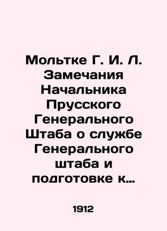 Moltke G. I. L. Comments by the Chief of the Prussian General Staff on the service of the General Staff and the preparation for it of Officers of the General Staff on the basis of the imperial maneuvers of 1909. In Russian (ask us if in doubt)/Moltke G. I. L. Zamechaniya Nachalnika Prusskogo Generalnogo Shtaba o sluzhbe Generalnogo shtaba i podgotovke k ney Ofitserov Generalnogo Shtaba na osnovanii imperatorskikh manevrov 1909 goda. Translated by Colonel Schildbach. Warsaw: Typography of the District Staff 1912 8 54 p. SKUalbb83dbf4708273129.