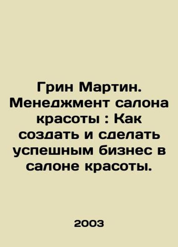Green Martin. Beauty Salon Management: How to Create and Succeed a Beauty Salon Business. In Russian /Grin Martin. Menedzhment salona krasoty: Kak sozdat i sdelat uspeshnym biznes v salone krasoty. Translated from English by the beauty parlour owner. M RIPOL classic 2003.We have thousands of titles and often several copies of each title may be available. Please feel free to contact us for a detailed description of the copies available. SKUalbb93cb3b824005be7.