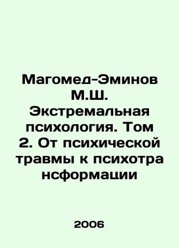 Magomed-Eminov M.Sh. Extreme Psychology. Volume 2. From Psychological Trauma to Psychotransformation In Russian /Magomed-Eminov M.Sh. Ekstremalnaya psikhologiya. Tom 2. Ot psikhicheskoy travmy k psikhotransformatsii Moscow Psychoanalytical Association 2006. We have thousands of titles and often several copies of each title may be available. Please feel free to contact us for a detailed description of the copies available. SKUalbba2b7e3cc489bc8b.