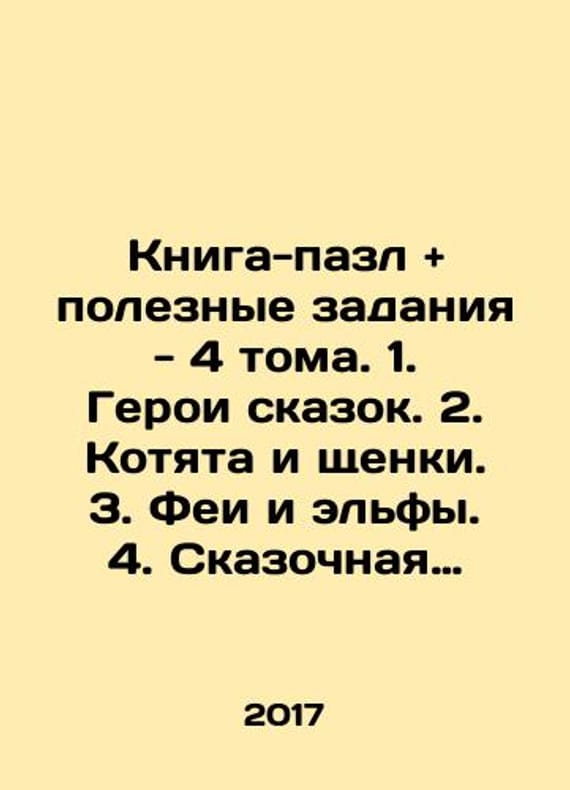 Puzzle book and useful tasks - 4 volumes. 1. Heroes of fairy tales. 2. Kittens and puppies. 3. Fairies and elves. 4. Fabulous alphabet and funny poems. In Russian /Kniga-pazl and poleznye zadaniya - 4 toma. 1. Geroi skazok. 2. Kotyata i shchenki. 3. Fei i elfy. 4. Skazochnaya azbuka and veselye stishki. M. Crystal Beech. 2017-2018. We have thousands of titles and often several copies of each title may be available. Please feel free to contact us for a detailed description of the copies available. SKUalbbb51f6b7e1393ac1.