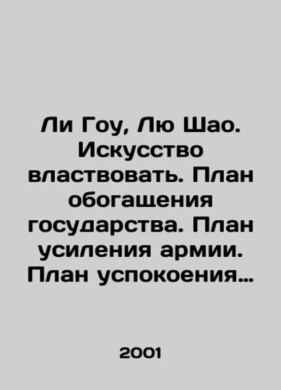 Li Gou, Liu Shao. The Art of Power. A Plan to Enrich the State. A Plan to Strengthen the Army. A Plan to Calm the People (11th Century). About the Human Being (3rd Century). In Russian /Li Gou, Lyu Shao. Iskusstvo vlastvovat. Plan obogashcheniya gosudarstva. Plan usileniya armii. Plan uspokoeniya naroda (XI v.). O chelovecheskom sushchestve (III v.). Series: The Canons. Translation from Chinese by G.V.Zinoviev. M. White Alves, 2001, 288 p. We have thousands of titles and often several copies of each title may be available. Please feel free to contact us for a detailed description of the copies available. SKUalbbc32dc887efb2d9b.