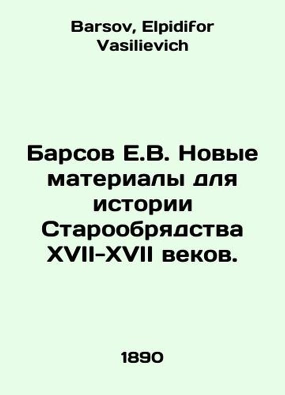 Barsov E.V. New materials for the history of the Old Believer of the seventeenth-seventeenth centuries. In Russian /Barsov E.V. Novye materialy dlya istorii Staroobryadstva XVII-XVII vekov. Moscow University Printing House. 1890. XII., 243p. We have thousands of titles and often several copies of each title may be available. Please feel free to contact us for a detailed description of the copies available. SKUalbbc57275969b06216.