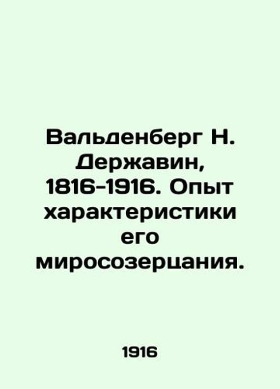Waldenberg N. Derzhavin 1816-1916. Experience characterizing his worldview. In Russian (ask us if in doubt)/Valdenberg N. Derzhavin 1816-1916. Opyt kharakteristiki ego mirosozertsaniya.. Petrograd Typography by V.D. Smirnov 1916 265 p. SKUalbbe0b555735192319.