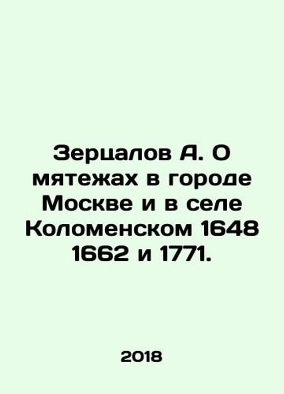 A. Zertsalov On the rebellions in the city of Moscow and in the village of Kolomensky 1648 1662 and 1771. In Russian /Zertsalov A. O myatezhakh v gorode Moskve i v sele Kolomenskom 1648 1662 i 1771. Moscow Publishing House V. Sekachev 2018. 440s. We have thousands of titles and often several copies of each title may be available. Please feel free to contact us for a detailed description of the copies available. SKUalbbf71ceb980fbd467.