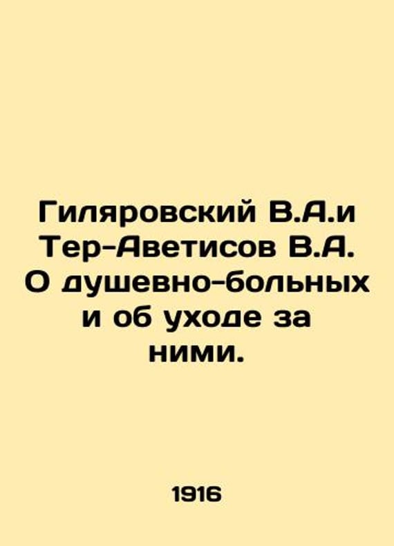 Gilyarovsky V.A. and Ter-Avetisov V.A. About the mentally ill and their care. In Russian /Gilyarovskiy V.A.i Ter-AvetisovV.A. Odushevno-bolnykh i ob ukhode za nimi. A Brief Guide for the Sisters of Mercy. Moscow Headquarters of the Moscow Military District 1916 81c. We have thousands of titles and often several copies of each title may be available. Please feel free to contact us for a detailed description of the copies available. SKUalbc0dabc281641e625.