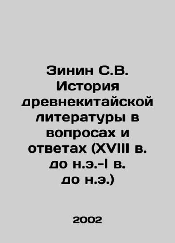 Zinin S.V. History of Ancient Chinese Literature in Questions and Answers (18th Century BC-1st Century BC) In Russian /Zinin S.V. Istoriya drevnekitayskoy literatury v voprosakh i otvetakh (XVIII v. do n.e.-I v. don.e.)M. Institute of Oriental Studies RAS 2002.We have thousands of titles and often several copies of each title may be available. Please feel free to contact us for a detailed description of the copies available. SKUalbc14b735978d9c4ec.