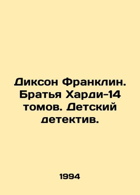 Dickson Franklin. The Hardy Brothers - 14 volumes. Child Detective. /Dikson Franklin. Brat'ya Khardi-14 tomov. Detskiy detektiv. M. Top secret. 1994-1995. 230-320ss. 1. Mystery of the old mS.Pb.Mystery of the spiral bridge. 2. Mystery of the stolen effigy. Mystery of the secret door. 3. Mystery of the abandoned tunnel. Mystery of the split helmet. 4. Secret agent flies # 101. While the clock is ticking. 5. A baseball card scam. Ghost stories. 6. Mystery of the Silver Star. Mystery of the Roaring River. 7. Steep turns. Sabotage at the Olympics. 8. Danger in the Fourth Dimension. Beaters of rock and roll. 9. Case of cosmic abduction. Mystery of the shackles canyon. 10. Murderers in black. Mystery of the toy store. 11. End of the King of computers. Death at the tip of the bat. 1 We have thousands of titles and often several copies of each title may be available. Please feel free to contact us for a detailed description of the copies available. SKUalbc269019406035854