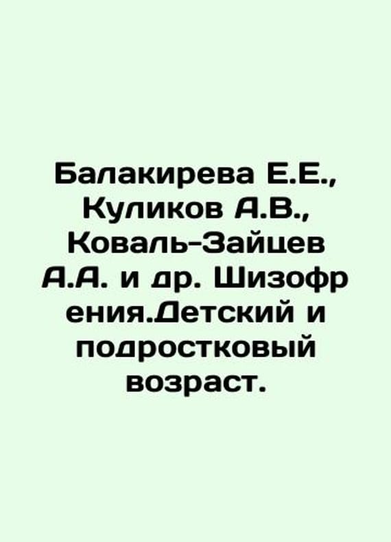Balakireva E.E., Kulikov A.V., Koval-Zaitsev A.A. et al. Schizophrenia. Childhood and adolescence. In Russian /Balakireva E.E., Kulikov A.V., Koval-Zaytsev A.A. i dr. Shizofreniya.Detskiy i podrostkovyy vozrast. M Gaotar Media Guide 2023 96 pp. We have thousands of titles and often several copies of each title may be available. Please feel free to contact us for a detailed description of the copies available. SKUalbc331cccf163ee489.