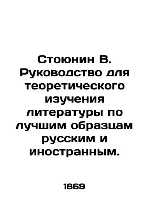 Stoyunin V. A guide to the theoretical study of literature on the best Russian and foreign samples. In Russian /Stoyunin V. Rukovodstvo dlya teoreticheskogo izucheniya literatury po luchshim obraztsam russkim i inostrannym. S.Pb.1869. 192s. We have thousands of titles and often several copies of each title may be available. Please feel free to contact us for a detailed description of the copies available. SKUalbc5b25d03b473678e.