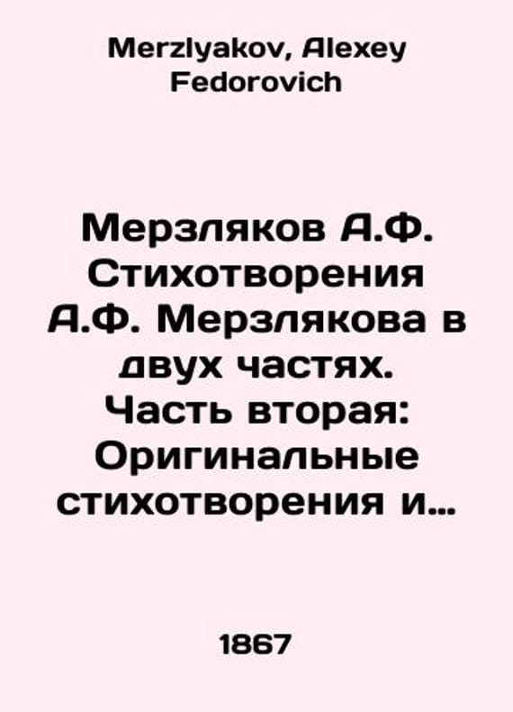 Merzlyakov A.F. Poems by A.F. Merzlyakov in two parts. Part Two: Original poems and translations from the newest writers. In Russian /Merzlyakov A.F. Stikhotvoreniya A.F. Merzlyakova v dvukh chastyakh. Chast vtoraya: Originalnye stikhotvoreniya i perevody iz noveyshikh pisateley. Printed under the editorship of the active member of M.P.Poludensky. Moscow: Edition of the Russian Literature Amateurs Association under the Imp. Moscow Printing House Grachev and Compilation of 1867, 6, 351- 656, 01-010, 2 p., (26.0x17.0 sm.). We have thousands of titles and often several copies of each title may be available. Please feel free to contact us for a detailed description of the copies available. SKUalbc71e252727155bf1.