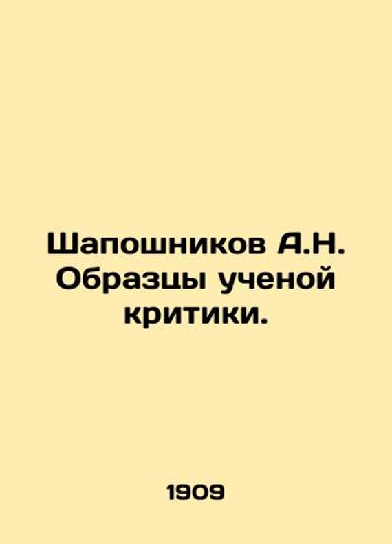 Shaposhnikov A.N. Samples of Scientific Criticism. In Russian /Shaposhnikov A.N. Obraztsy uchenoy kritiki. Moscow Printing House of the Russian Partnership 1909. 29 p. We have thousands of titles and often several copies of each title may be available. Please feel free to contact us for a detailed description of the copies available. SKUalbc7db8c4cb6f06103.
