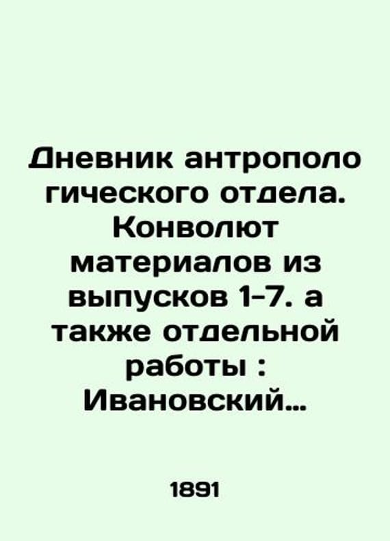 Diary of the Anthropological Department: A Convolutee of Materials from Issues 1-7 as well as a Separate Work: Ivanovsky A.A. Anthropological Essay of the Merchants. In Russian (ask us if in doubt)/Dnevnik antropologicheskogo otdela. Konvolyut materialov iz vypuskov 1-7. a takzhe otdel'noy raboty: Ivanovskiy A.A. Antropologicheskiy ocherk torgoutov. description: In Russian (ask us if in doubt).Part 2 Ottoman Turks (St.61-St.82 St.83-St.120) Ivanovsky A. Turkmen and Turks on craniometric research (St.93-St.127) Lyubov A. On the question of the comparative strength of teeth (in ethnological and other respects) (St.129-St.182) Mainov V. Materials on the anthropology of Mordva-Erzya-Nizhny Novgorod county (St.186-St.192) Ivanovsky A. Anthropological sketch of the trade outlets of Targabat region the Chinese Empire (St.1- St.120) Ginkulov O. Skull from the ancient graves of the South Bank of Crimea (St.1- St.16). We have thousands of titles and often several copies of each title may be available. Please feel free to contact us for a detailed description of the copies available. SKUalbc7ff1cb427d50189