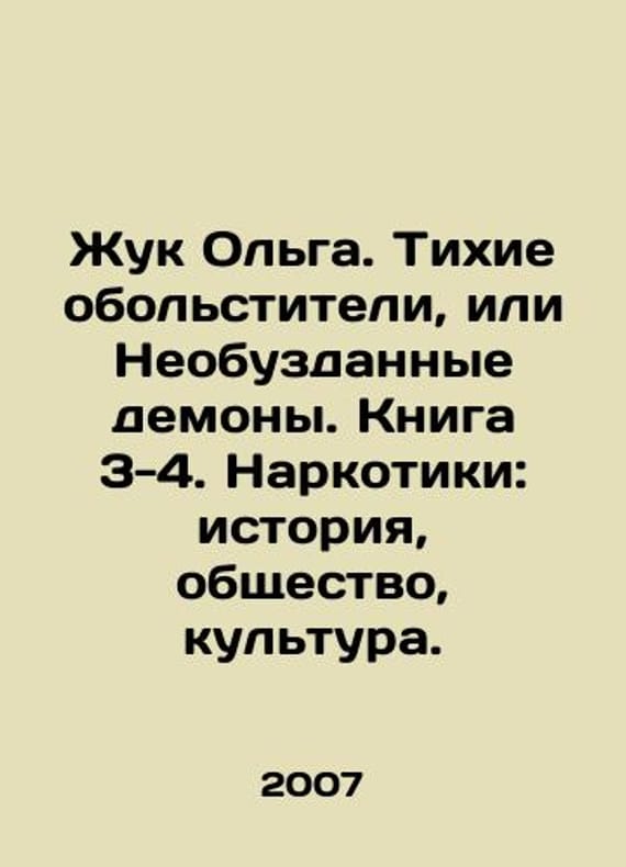 Beetle Olga. Silent seducers or Unbridled Demons. Book 3-4. Drugs: History, Society, Culture. In Russian /Zhuk Olga. Tikhie obolstiteli, ili Neobuzdannye demony. Kniga 3-4. Narkotiki: istoriya, obshchestvo, kultura. St. John the Red Sailor 2007. Book 3-4: (3) Hallucinogens, mushrooms, cacti, psychedelic drugs, (4) coca and cocaine. O.A. Beetles monograph addresses a pressing and complex problem of the modern world. It examines a wide range of issues, including descriptions of various types of drugs (opiates, cannabis derivatives, hallucinogens, coca derivatives) and their use in a broad historical and cultural context. We have thousands of titles and often several copies of each title may be available. Please feel free to contact us for a detailed description of the copies available. SKUalbc82381cd6e5a4219.