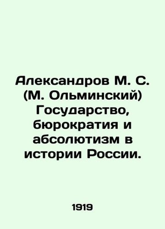 Aleksandrov M. S. (M. Olminsky) State, bureaucracy and absolutism in the history of Russia. In Russian /Aleksandrov M. S. (M. Olminskiy) Gosudarstvo, byurokratiya i absolyutizm v istorii Rossii. Second edition, supplemented. Moscow, Pg.: Communist, 1919. We have thousands of titles and often several copies of each title may be available. Please feel free to contact us for a detailed description of the copies available. SKUalbc9f9fb63f7a60fed.