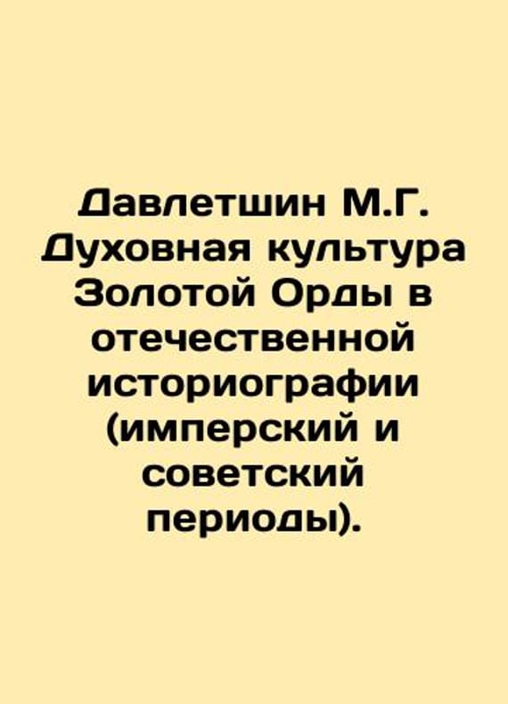 Davletshin M. G. Spiritual culture of the Golden Horde in Russian historiography (imperial and Soviet periods). In Russian /Davletshin M. G. Dukhovnaya kultura Zolotoy Ordy v otechestvennoy istoriografii (imperskiy i sovetskiy periody). Series: History and Culture of the Golden Horde and the Tatar Khanates. Volume 33. Scientific Editor, Doctor of Historical Sciences, I. K. Zagidullin. Kazan: From the Institute of History named after Sh. Marjani of the Academy of Sciences of the Republic of Tatarstan, 2023. 272 p. We have thousands of titles and often several copies of each title may be available. Please feel free to contact us for a detailed description of the copies available. SKUalbe9574bd6082b0917.