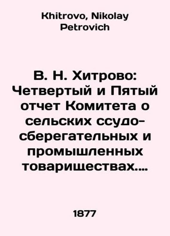 V.N. Khitrovo: Fourth and Fifth Report of the Committee on Rural Savings and Loan Associations and Industrial Associations. 1877-1878 In Russian /V. N. Khitrovo: Chetvertyy i Pyatyy otchet Komiteta o selskikh ssudo-sberegatelnykh i promyshlennykh tovarishchestvakh.1877-1878 gg. Committee on Rural Savings and Loan Associations (Moscow) St. Petersburg: Type V. Kirshbaum, 1877-1878. 120 c. We have thousands of titles and often several copies of each title may be available. Please feel free to contact us for a detailed description of the copies available. SKUalbcc260c6a8a381cc4.