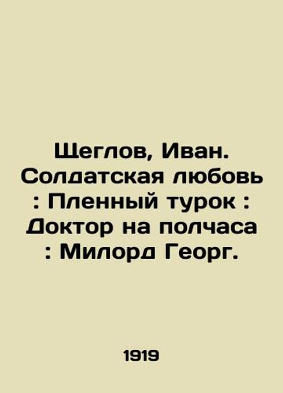 Shcheglov, Ivan. Soldiers love: Captive Turk: The Doctor for half an hour: Milord George. In Russian /Shcheglov, Ivan. Soldatskaya lyubov: Plennyy turok: Doktor na polchasa: Milord Georg. St. Petersburg Theatre Department of the Peoples Committee for Education 1919. We have thousands of titles and often several copies of each title may be available. Please feel free to contact us for a detailed description of the copies available. SKUalbccc10fee16e65721.