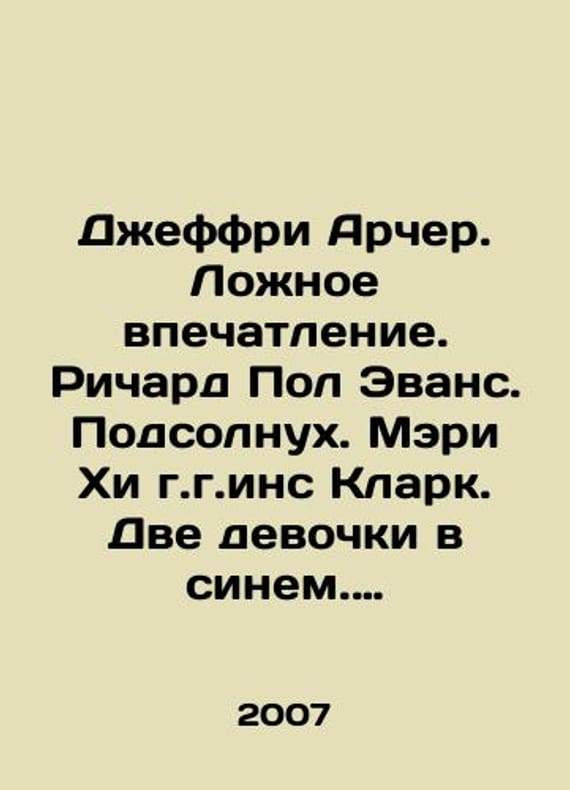 Jeffrey Archer. False impression. Richard Paul Evans. Sunflower. Mary Hee, Ince Clark. Two Girls in Blue. John Grogan. Marley and I. In Russian /Dzheffri Archer. Lozhnoe vpechatlenie. Richard Pol Evans. Podsolnukh. Meri Khi g.g.ins Klark. Dve devochki v sinem. Dzhon Grogan. Marli i ya. Readers Digest. Selected Novels. Moscow. Readers Digest Publishing House. 2007. 576 p. We have thousands of titles and often several copies of each title may be available. Please feel free to contact us for a detailed description of the copies available. SKUalbcd8580e539ea03d3.