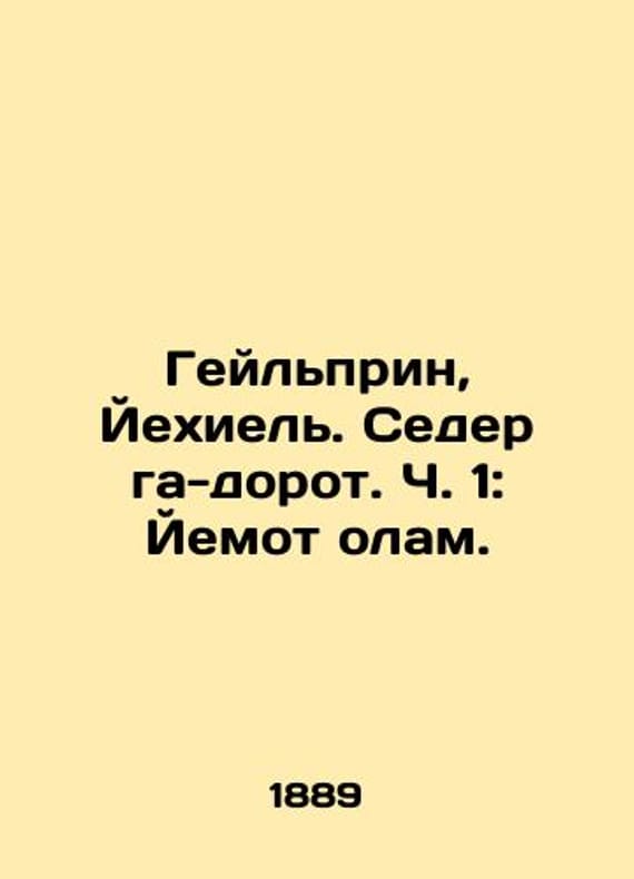 Heilprin, Yehiel. Seder ha-dorot. Part 1: Yemot olam. In Russian /Geylprin, Yekhiel. Seder ga-dorot. Ch. 1: Yemot olam. Warsaw, type. B. Tursch, 1889. 296 p. We have thousands of titles and often several copies of each title may be available. Please feel free to contact us for a detailed description of the copies available. SKUalbce3dd342cb9f281e.