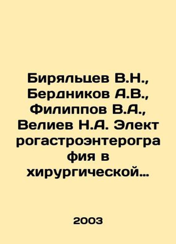 Biryaltsev V.N., Berdnikov A.V., Filippov V.A., Veliev N.A. Electrogastroenterography in surgical gastroenterology. In Russian /Biryaltsev V.N., Berdnikov A.V., Filippov V.A., Veliev N.A. Elektrogastroenterografiya v khirurgicheskoy gastroenterologii. Kazan Medical University. 2003. 156 pp. We have thousands of titles and often several copies of each title may be available. Please feel free to contact us for a detailed description of the copies available. SKUalbcf3e2dff1d54a183.