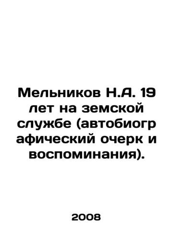 N.A. Melnikov spent 19 years in Zemsky service (autobiographical essay and memoirs). In Russian /Melnikov N.A. 19 let na zemskoy sluzhbe (avtobiograficheskiy ocherk i vospominaniya).Introductory article and comments by A.G. Akshikov. Yoshkar-Ola. MarNIIYALI. 2008.We have thousands of titles and often several copies of each title may be available. Please feel free to contact us for a detailed description of the copies available. SKUalbd025d311248c8461.