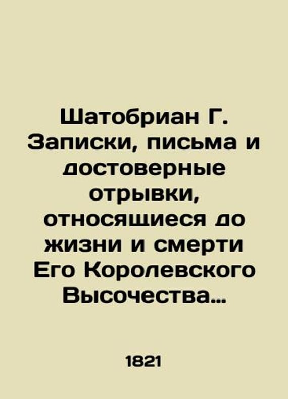 Chateaubriand G. Notes letters and trustworthy passages relating to the life and death of His Royal Highness Carl Ferdinand dArtois Prince of France of the Duke of Berries. In Russian (ask us if in doubt)/Shatobrian G. Zapiski pisma i dostovernyChateaubriand G. Notes letters and trustworthy passages relating to the life and death of His Royal Highness Carl Ferdinand dArtois Prince of France of the Duke of Berries. In Russian (ask us if in doubt)/Shatobrian G. Zapiski pisma i dostovernye otryvki otnosyashchiesya do zhizni i smerti Ego Korolevskogo Vysochestva Karla Ferdinanda dArtua Frantsuzskogo printsa gertsoga Berriyskogo.Part Two. Orel In I. Sytins printing house 1821. 151s. We have thousands of titles and often several copies of each title may be available. Please feel free to contact us for a detailed description of the copies available. SKUalbd0524796b51c6d99