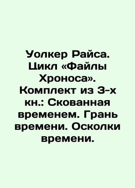 Rices Walker: The Chronos Files Cycle. Set of 3 books: Time-bound. Time frontier. Time fragments. In Russian /Uolker Raysa. Tsikl «Fayly Khronosa». Komplekt iz 3-kh kn.: Skovannaya vremenem. Gran vremeni. Oskolki vremeni. Series: Young Adult. The Chronos Files. M.: Exmo, 2021 416 and 512 et seq. (ISBN: 978-5-04-112674-2 9785041126742) How did the impossible happen for Kate in 1893? Her grandmothers strange medallion turns out to be the key to the headquarters of Chronos, an organization of historians from the future who travel through time. Kate soon discovers that reality has changed and her parents no longer exist, and she survived only by protecting the key. Someone killed Kates grandmother when she was in the nineteenth century. We have thousands of titles and often several copies of each title may be available. Please feel free to contact us for a detailed description of the copies available. SKUalbd124e7cd02746f9d.