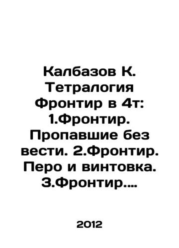 Kalbazov K. Tetralogy Frontier in 4t: 1 Frontier. Missing. 2 Frontier. Pen and rifle. 3 Frontier. Road for two. 4 Frontier. City in the steppe. In Russian /Kalbazov K. Tetralogiya Frontir v 4t: 1.Frontir. Propavshie bez vesti. 2.Frontir. Pero i vintovka. 3.Frontir. Doroga na dvoikh. 4.Frontir. Gorod v stepi. Series: A Fantastic Action Movie. M Alpha Book 2012-2013. We have thousands of titles and often several copies of each title may be available. Please feel free to contact us for a detailed description of the copies available. SKUalbd2e4ecc5915d353f.