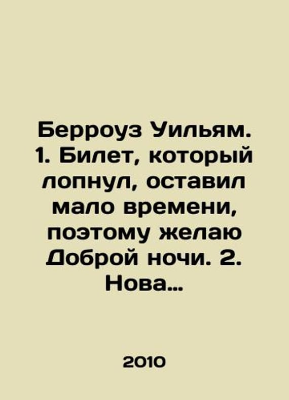 Burroughs William. 1. The ticket that burst left little time, so I wish you a good night. 2. Nova Express.-2 volumes. In Russian /Berrouz Uilyam. 1. Bilet, kotoryy lopnul, ostavil malo vremeni, poetomu zhelayu Dobroy nochi. 2. Nova Ekspress.-2 toma. M. Ast. 2010. 222 and 217p.p. Unified design. We have thousands of titles and often several copies of each title may be available. Please feel free to contact us for a detailed description of the copies available. SKUalbd457262ce5a9bd02.