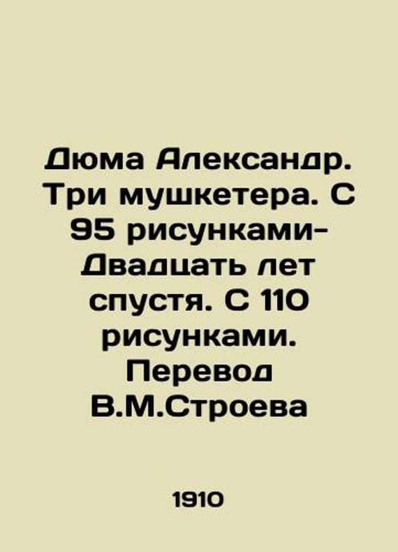 Dumas Alexander. The Three Musketeers. With 95 drawings - Twenty years later. With 110 drawings. Translation by V.M.Stroyev In Russian /Dyuma Aleksandr. Tri mushketera. S 95 risunkami-Dvadtsat let spustya. S 110 risunkami. Perevod V.M.Stroeva Complete collection of novels by Alexander Dumas (father). Edited by P.V.Bykov, published by P.P.Soikin in 1910, 576, III p. S.Pb.and 763, IV p. The most famous novels of the great Frenchman. We have thousands of titles and often several copies of each title may be available. Please feel free to contact us for a detailed description of the copies available. SKUalbd4cccd5158b1e125.