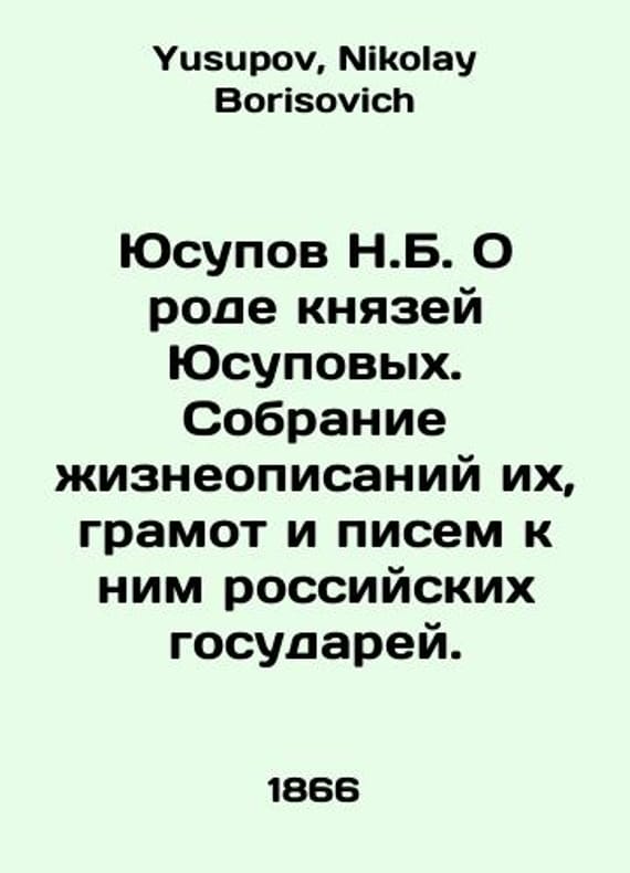 Yusupov N.B. On the genus of the Yusupov princes. A collection of their biographies, letters and letters to them from Russian rulers. In Russian /Yusupov N.B. O rode knyazey Yusupovykh. Sobranie zhizneopisaniy ikh, gramot i pisem k nim rossiyskikh gosudarey. From the sixteenth to the half of the nineteenth century, and other family papers, with the addition of a generational mural of the ancestors of the Yusupov princes from the sixteenth century. We have thousands of titles and often several copies of each title may be available. Please feel free to contact us for a detailed description of the copies available. SKUalbd590e6758d8c5deb.