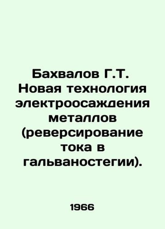 G.T. Bakhvalovs New Technology for Electrodeposition of Metals (Reversing Current in Galvanostogies). In Russian /Bakhvalov G.T. Novaya tekhnologiya elektroosazhdeniya metallov (reversirovanie toka v galvanostegii). M. Metallurgy 1966. 152s. We have thousands of titles and often several copies of each title may be available. Please feel free to contact us for a detailed description of the copies available. SKUalbd69761f7cff0cfc6.