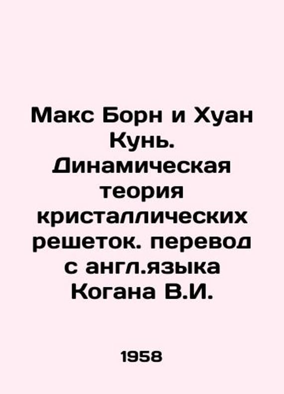 Max Born and Huang Kun. Dynamic theory of crystalline lattice. In Russian /Maks Born i Khuan Kun. Dinamicheskaya teoriya kristallicheskikh reshetok. perevod s angl.yazyka Kogana V.I. M. Publishing House of Foreign Literature 1958. 488 pp. We have thousands of titles and often several copies of each title may be available. Please feel free to contact us for a detailed description of the copies available. SKUalbd85a45e1828c008d.