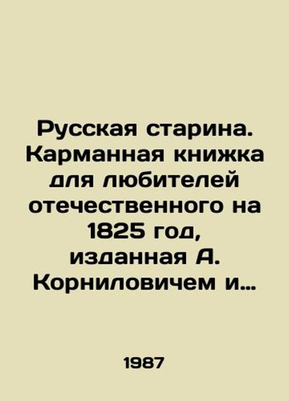 Russian Old Man. Pocket book for lovers of Russian for 1825, published by A. Kornilovich and an appendix to the facsimile edition. In Russian /Russkaya starina. Karmannaya knizhka dlya lyubiteley otechestvennogo na 1825 god, izdannaya A. Kornilovichem i prilozhenie k faksimilnomu izdaniyu. 1824 M.: 1987. 364p. We have thousands of titles and often several copies of each title may be available. Please feel free to contact us for a detailed description of the copies available. SKUalbd9d3752987f88467.