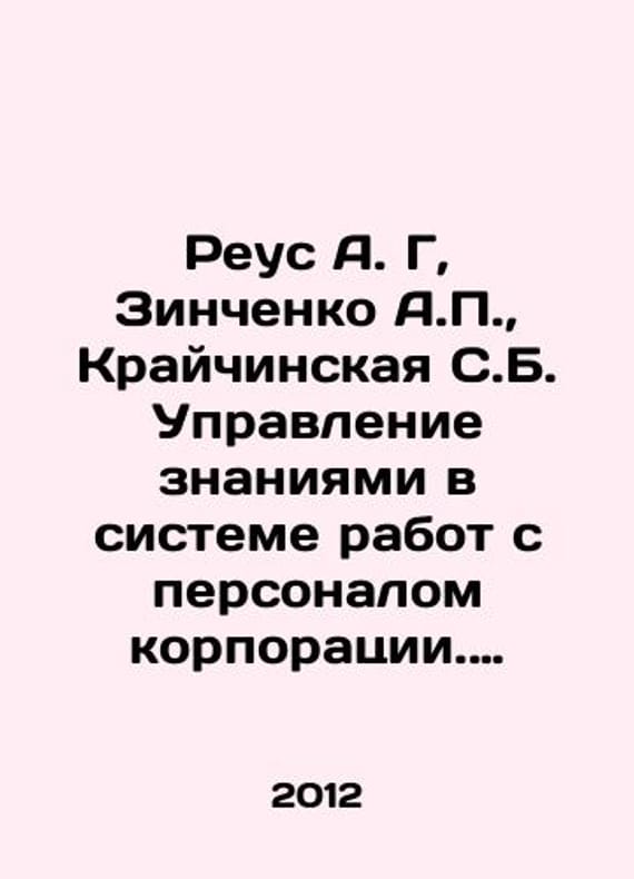 Reus A. G, Zinchenko A., Kraichinskaya S.B. Knowledge management in the system of work with corporate personnel. Corporate anthropoengineering. In Russian /Reus A. G, Zinchenko A., Kraychinskaya S.B. Upravlenie znaniyami v sisteme rabot s personalom korporatsii. Korporativnaya antropotekhnika. Methodological School of Management under the leadership of G. Shchedrovitsky in 8 vt. Tom.8) M. Alpina Publisher 2012.We have thousands of titles and often several copies of each title may be available. Please feel free to contact us for a detailed description of the copies available. SKUalbdba069097f753b37.