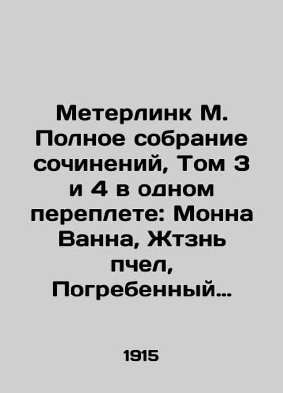 Meterlink M. Complete collection of essays, Volumes 3 and 4 in one cover: Monna Vanna, The Reap of Bees, The Buried Temple, Mary Magdalene, The Double Garden, The Reason of Flowers In Russian /Meterlink M. Polnoe sobranie sochineniy, Tom 3 i 4 v odnom pereplete: Monna Vanna, Zhtzn pchel, Pogrebennyy khram, Mariya Magdalina, Dvoynyy sad, Razum tsvetov Petrograd Edition of A.F. Marx 1915. We have thousands of titles and often several copies of each title may be available. Please feel free to contact us for a detailed description of the copies available. SKUalbdcc0eb0ea4426d75.