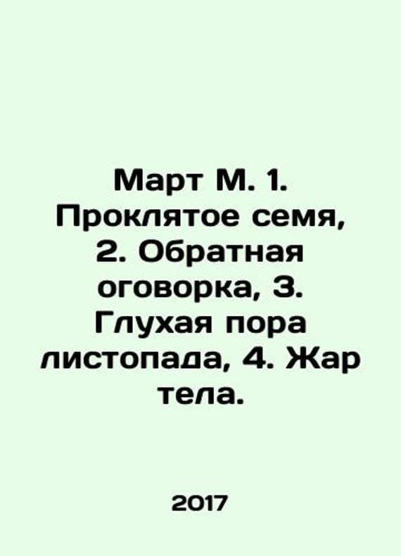 March M. 1. Damned Seed, 2. Backward Reservation, 3. Deaf leaf-drop pore, 4. Body heat. In Russian /Mart M. 1. Proklyatoe semya, 2. Obratnaya ogovorka, 3. Glukhaya pora listopada, 4. Zhar tela. Series: Master of Crime Novel. Moscow, 2017. We have thousands of titles and often several copies of each title may be available. Please feel free to contact us for a detailed description of the copies available. SKUalbde0ecd182975d808.