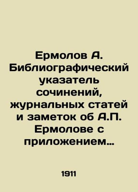 Yermolov A. Bibliographic index of essays magazine articles and notes about Yermolov together with a list of his portraits for the 50th anniversary of his death In Russian (ask us if in doubt)/Ermolov A. Bibliograficheskiy ukazatel sochineniy zhurnalnykh statey i zametok ob A.P. Ermolove s prilozheniem perechnya ego portretov k 50-letiyu so dnya ego konchiny Short description: In Russian (ask us if in doubt).Appendix to the journal Russian Bibliophile 1911 36 p. We have thousands of titles and often several copies of each title may be available. Please feel free to contact us for a detailed description of the copies available. SKUalbdf355abaaacd7675